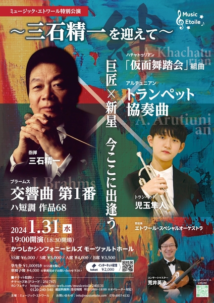 ミュージック・エトワール主催、ミュージック・エトワール特別公演「絆」が2024年1月31日 (水)にかつしかシンフォニーヒルズ モーツァルトホール(東京都葛飾区立石六丁目33番1号)にて開催されます。