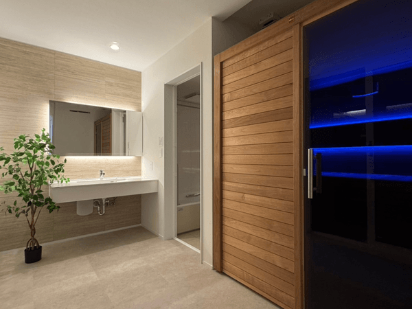 サウナまわりの導線にもこだわりが詰まっており、サウナ・浴室から、ガレージのととのいスペースにダイレクトにアクセスできるようになっています。水回りにはReFa ULTRAFINE BUBBLE SUIGENを採用。暮らしの隅々まで上質に整っています。