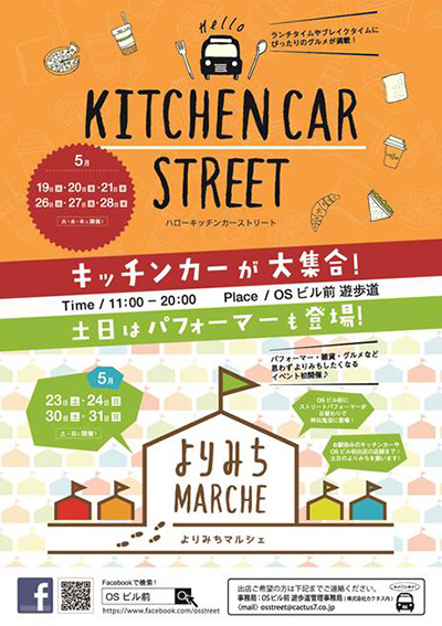 2015年5月18日 17:15大阪・梅田のOSビル(大阪市北区小松原町3-3)前遊歩道にて、日替わりでおしゃれなキッチンカーを集合させた「Hello Kitchencar Street」 を開催いたします。土日は「よりみちマルシェ」として、パフォーマー・雑貨・グルメなど思わず「よりみち」したくなるイベントも初開催します。ちょっとしたランチタイムや息抜きのブレイクタイム、待ち合わせまでの一杯など、おいしい時間を存分にお楽しみください。