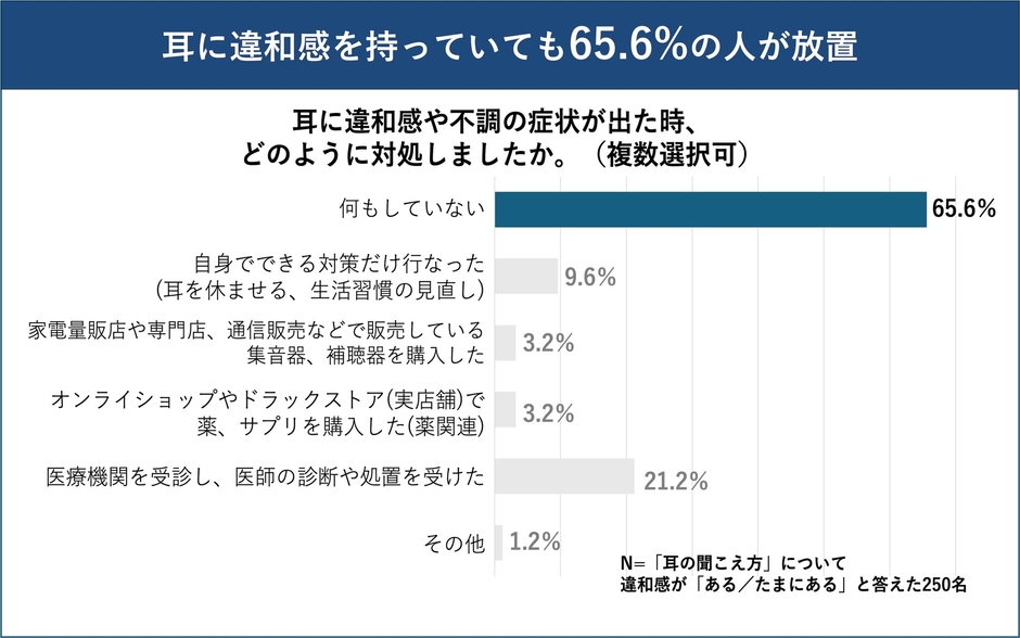 耳の聞こえ方」について違和感を持ったことがあると回答した人に、その後の対応について尋ねると、65.6%が「特に何もしなかった」と回答しており、多くの人が耳の違和感を放置している実態が浮き彫りとなりました。
