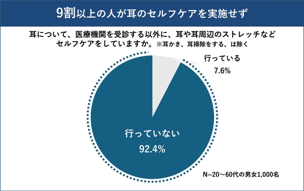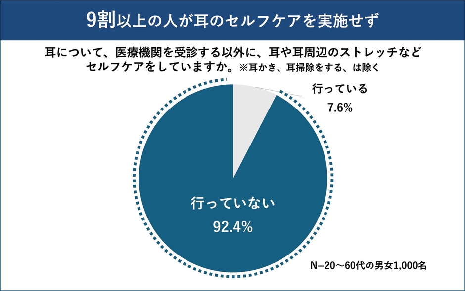 医療機関の受診以外に、耳や耳周辺のストレッチ、耳に良いとされるサプリの摂取、耳ケア用の市販商品の使用などのセルフケア(※プールや入浴後に耳に入った水分を綿棒で拭う、耳かき・耳掃除は除く)について尋ねたところ、92%の人が「行っていない」と回答しました。