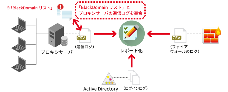 「BlackDomainSensor」は、悪性サイトまたはその確度が高いURL情報である「BlackDomainリスト」とインターネット通信ログを突き合わせ、それらのサイトと接続した社内の端末のレポートを日次で自動的に作成します。また、企業内に侵入したマルウェアがActive Directoryにアクセスする挙動を検知し、マルウェアがどこまで深く入り込んでいるのかを可視化します。「BlackDomainSensor」の利用により、マルウェアの侵入が検知された場合には、悪性サイトへの通信遮断、マルウェア検査サービスの利用、PCの初期化といった次の一手を即座に講じることで、被害を未然に防いだり、被害規模の最小化を実現します。なお、「BlackDomainSensor」は年間サブスクリプション・ライセンスとして提供されるため、通常のパッケージ・ソフトウェアの導入にかかる初期費用を抑えることが可能です。