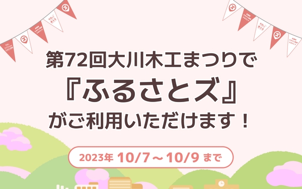 この秋の開催から、当社サービスの店舗型ふるさと納税(R)『ふるさとズ』を、大川木工まつりにて、『ふるさとズ』導入中の一部店舗でご利用が可能となります。