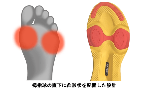 拇指球の直下に配置した凸形状の「ポジションガイドポッド」により、つま先で接地する足裏感覚を養います。日頃からつま先接地の感覚を身に着けることでトレーニング時の姿勢を改善し、正しいフットワークによりプレー時に最大パワーを発揮できるようになります。