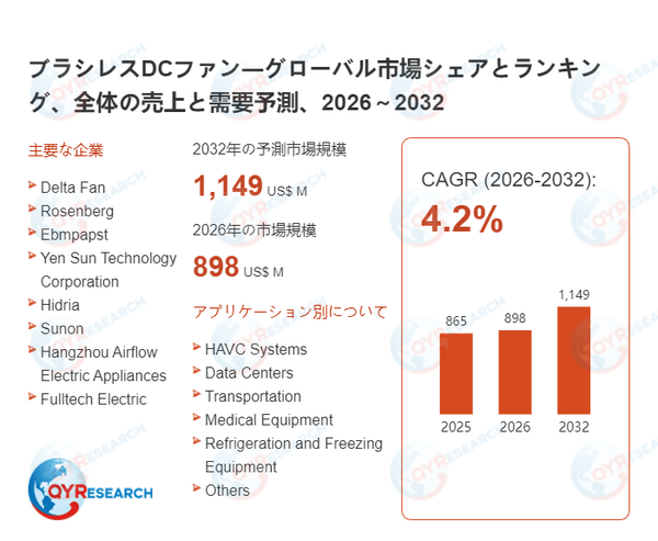 QYResearchが発表した新たな市場調査レポート「ブラシレスDCファン―グローバル市場シェアとランキング、全体の売上と需要予測、2026~2032」によると、世界のブラシレスDCファン市場規模は2025年の約865百万米ドルから2026年の896百万米ドルへと順調に拡大すると見込まれ、予測期間中は年平均成長率(CAGR)4.2%で成長し、2032年には1149百万米ドルに達すると予測されている。
