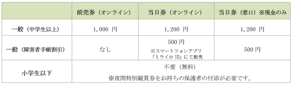 ※小学生以下のお子様は無料でご入場可能です。(夜間特別観賞券をお持ちの保護者の付添が必要)
