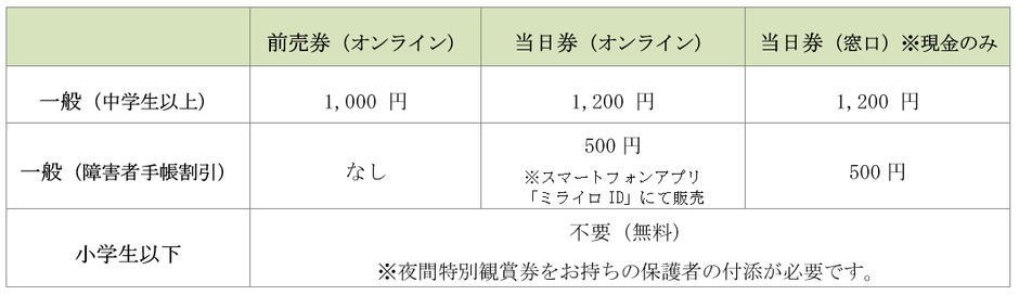 ※国内発行の障害者手帳をお持ちの方と付添者1名の方は当日券の割引がございます(割引後価格500円)。ミライロID(スマートフォン用アプリ)のチケット販売ページからご購入いただくか、当日夜間入園時間に窓口にて身体障害者手帳、愛の手帳、精神障害者保健福祉手帳、療育手帳、ミライロID等を提示して、ご購入ください。