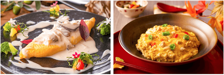 左:【朝食】出来立てオムレツ 信州きのこクリームソース。ライブキッチンでご注文毎にお作りするオムレツには、きのこを使ったクリーミーなソースを添えてご提供します。ふわふわ、とろとろの美味しさをお楽しみください。