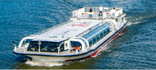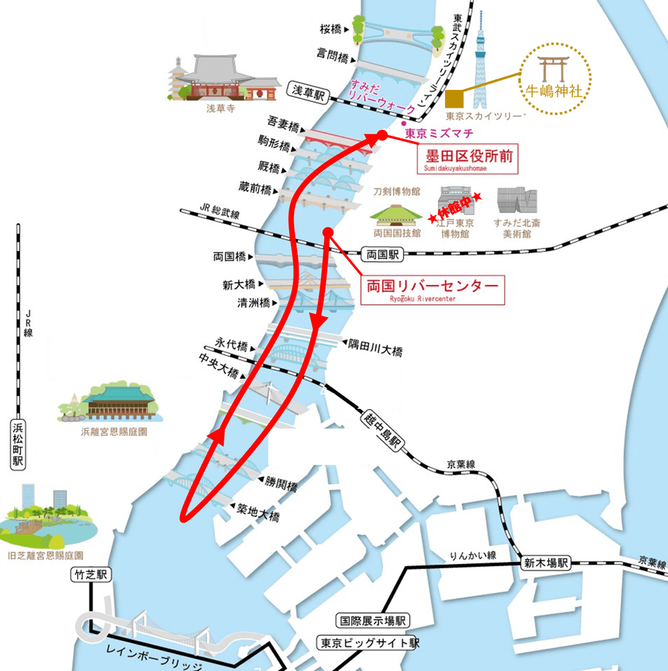⇒水上バス乗船(リバーガイド同乗)・両国リバーセンター発着場発(10時45分)