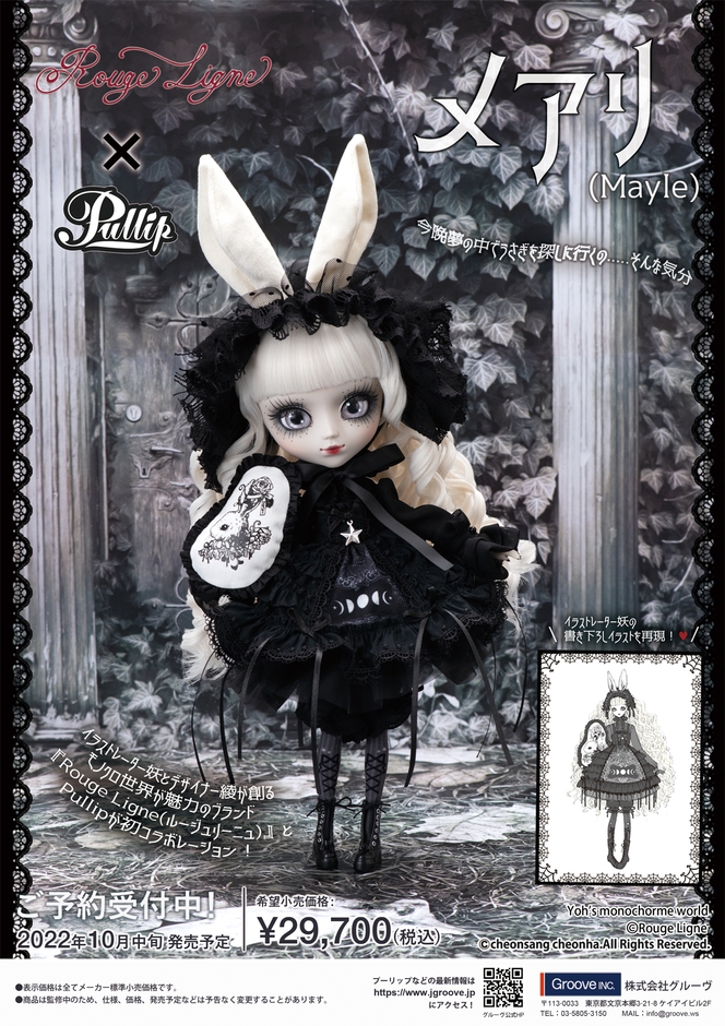 株式会社グルーヴは、ファッションドール「Pullip(プーリップ)」と、独自のモノクロ世界を描くイラストレーター妖とブランド『Princess Doll』のデザイナー綾がタッグを組んだファッションブランド『Rouge Ligne(ルージュリーニュ)』とのコラボレーションドールを販売いたします。