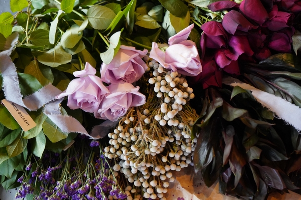 ブーケのメイン花材には、ROSE GALLERY創業以来バラの名花とされてきた品種、ヴィンテージローズを代表とする「パパメイアン」、神秘的な淡いブルーを纏った爽やかな香りの「ブルームーン」を使用。ふんわりと漂う香りは暮らしの中にささやかな癒しを与えてくれます。