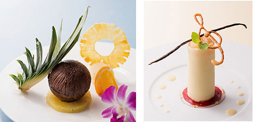 (左)COCO-ココ- (右)Peche Melba-ピーチ メルバ-ソプラノ歌手「ネリー・メルバ」に捧げたスイーツとして有名な「ペーシュ メルバ」をソラメンテスタイルにアレンジ。また、新作の「COCO-ココ-」は、ヤシの実をイメージした球体チョコレートスイーツ。球体を開けたときの驚きとともに、楽しいティータイムをお過ごしください。