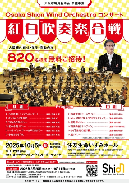 日本で最も長い歴史と伝統を誇る交響吹奏楽団「Osaka Shion Wind Orchestra(略称:Shion)」を有する公益社団法人大阪市音楽団(本社:大阪市住之江区/理事長:石井徹哉)の『Osaka Shion Wind Orchestra コンサート 紅⽩「吹奏楽」合戦』(2025年10月5日(日)、会場:住友生命いずみホール)に、⼤阪市内在住・在学・在勤の⽅ 820名様を無料でご招待します!