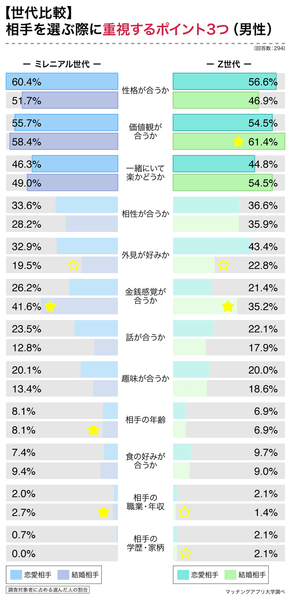 続いて、男性の世代別比較です。ミレニアル世代、Z世代とも、恋愛・結婚の双方に関して「性格が合うか」「価値観が合うか」「一緒にいて楽(変な気遣いが不要)かどうか」の3つが上位に並びました。