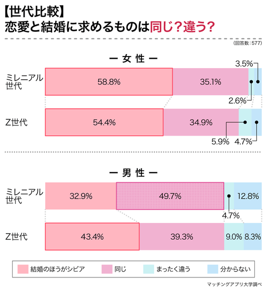 ミレニアル世代の男性は「恋愛も結婚も同じ」、その他は「結婚の方がシビア」