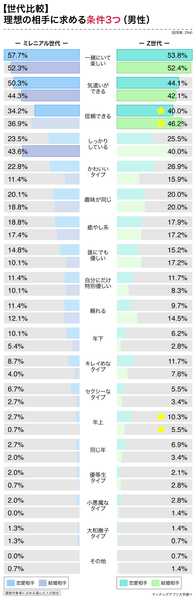 理想の恋愛・結婚相手に求める条件についても、世代間の違いを見てみました。