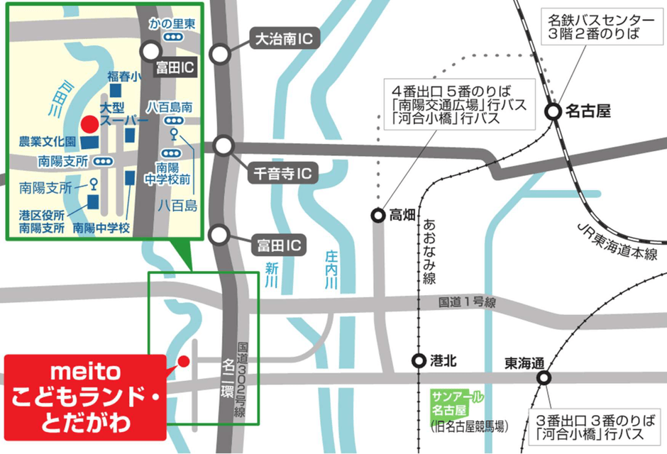 ●地下鉄東山線高畑駅 市バス「南陽交通広場」行き「八百島」下車徒歩10分 市バス「河合小橋」行き「南陽支所」下車徒歩10分