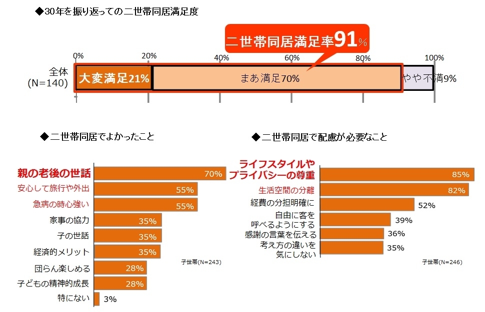 ・世帯別に水廻りや玄関が2つある「二世帯住宅」という住まい方は、30年暮らした家族から高く評価されている。二世帯同居の総合満足度は9割超。よかったことの1位は「親の老後の世話」。