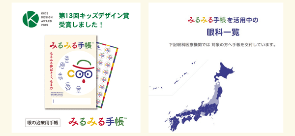 【みるみる手帳】は弱視斜視と診断された子どもと保護者のための眼の管理手帳。全国300以上の眼科医療機関で活用されメガネ専門店も記入しています。2年連続キッズデザイン賞受賞。改訂を重ねながら無償提供を続けています。