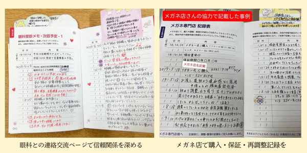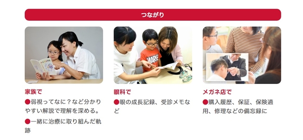 治療には治療用メガネが欠かせません。販売とアフターフォローを担当するメガネ専門店が記載するページを設けるなど、関係者が連携しやすい設計が画期的と評価されキッズデザイン賞を2年連続受賞(※2019年2020年)しています。