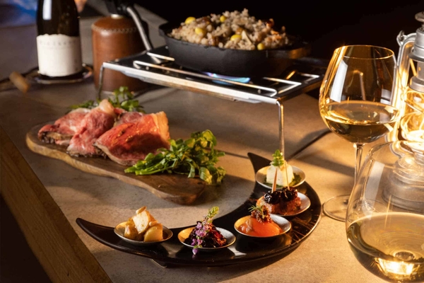 ディナーを提供する場所は、眼前に月光と河口湖の絶景を望むキャビンのテラスです。広々としたソファーが設えられたプライベート空間で、秋の味覚を使ったコース料理を楽しめます。前菜は、秋に収穫される米、麦、豆、粟、黍の五穀を、山梨県の郷土料理や食材に組み合わせた一品です。メインは、松茸や銀杏とともにダッチオーブンで炊き上げたごはんに、ローストビーフをのせ、出汁をかけて味わいます。料理に合わせるワインは、八ヶ岳のワイナリー「Mie Ikeno」の「月香 Chardonnay」です。ワインの持つ樽香や、豊かな果実味と厚みのある味わいが、それぞれの食材の香りや繊細な風味に寄り添います。月光がブドウ畑を照らす夜に収穫されたシャルドネのみで醸したと特別なワインは、美しい月を眺めながら楽しむのにぴったりです。テラスでゆっくりとお酒を嗜んだり、用意された望遠鏡で月を観察したりして、眼前に広がる月夜の絶景を心ゆくまで楽しみます。