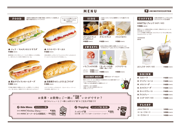 さらに、東京ミステリーサーカスに隠された謎を解き明かした者のみが注文することができる、不思議な裏メニューもご用意しています。スタートのヒントは、「HIMITSU COFFEE」現地のメニュー表に記載しています。こちらにもご注目を。