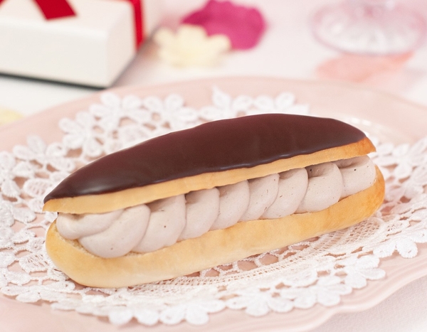 商品特徴:ふわふわなパンを「エクレア」風にアレンジ!口どけの良いとろけるチョコクリームをサンドしました。