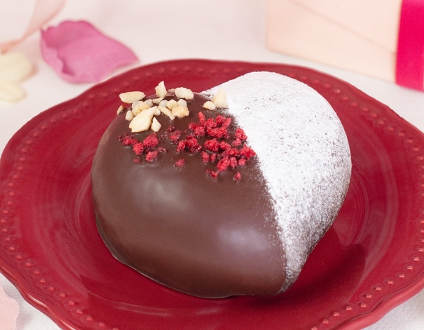 商品特徴:ハートの生地の中にチョコレートクリームを包み、さらにチョコレートでコーティング。アーモンドとラズベリーフレークを添えた甘酸っぱい香り漂うショコラパン。