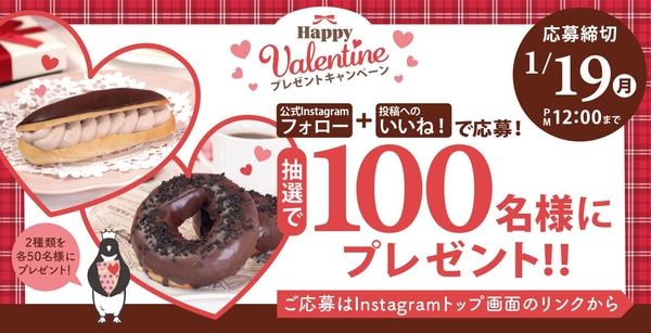 1月14日(水)にペンギンベーカリー公式Instagramへ投稿されるキャンペーン画像に「いいね!」をして、専用フォームよりご応募いただいたお客様の中から抽選で、「プチもちべえショコラクランチ」もしくは「エクレア風チョコクリームパン」をそれぞれ50名様(合計100名様)にプレゼントいたします。