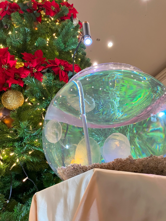 2023年にご好評いただいたクラゲ×クリスマス装飾を、2024年版にブラッシュアップして設置しました。不思議な半透明の生命体、クラゲとクリスマスツリー装飾で幻想的な空間をお楽しみください。自由に水中を舞うミズクラゲ その美しさと静けさ。 優雅に泳ぐその姿は、私たちに癒しを与えます。