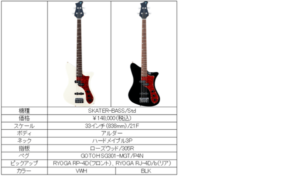 『SKATER/Std-RP90』はアルダーボディを活かした立ち上がりの良い中音域で、歌モノのバッキングにも扱いやすい点が魅力の1本。伝統的な木材でもあり、多くのジャンルの楽曲にマッチします。カラーは光沢あるブラック(BLK)とこなれた仕上がりのヴィンテージ・ホワイト(VWH)の2種類です。