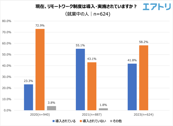 就業中の人に現在リモートワーク制度が導入されているか聞いたところ、「はい」が41.8%、「いいえ」が58.2%となり、リモートワークが導入されていない人のほうが、16.4ポイント多い結果となりました。2021年、2020年の同調査と比較すると「導入されている」割合は2021年がピークで55.1%となりました。コロナの状況が落ち着き、企業はリモートワークを減らしていることがうかがえます。