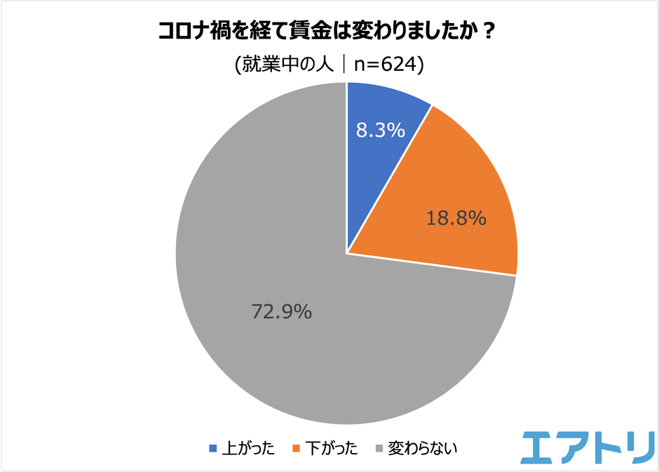 就業中の人に、コロナ禍を経て賃金が変わったかどうかを聞いたところ、「変わらない」人が最多で72.9%、「下がった」人が18.8%、「上がった」人が8.3%となりました。賃金に影響がない人がほとんどで、賃金が上がった人は1割未満という結果になりました。物価上昇が未だ止まらない現状かつ賃金が上がらないという非常に苦しい状況にある人が多いようです。