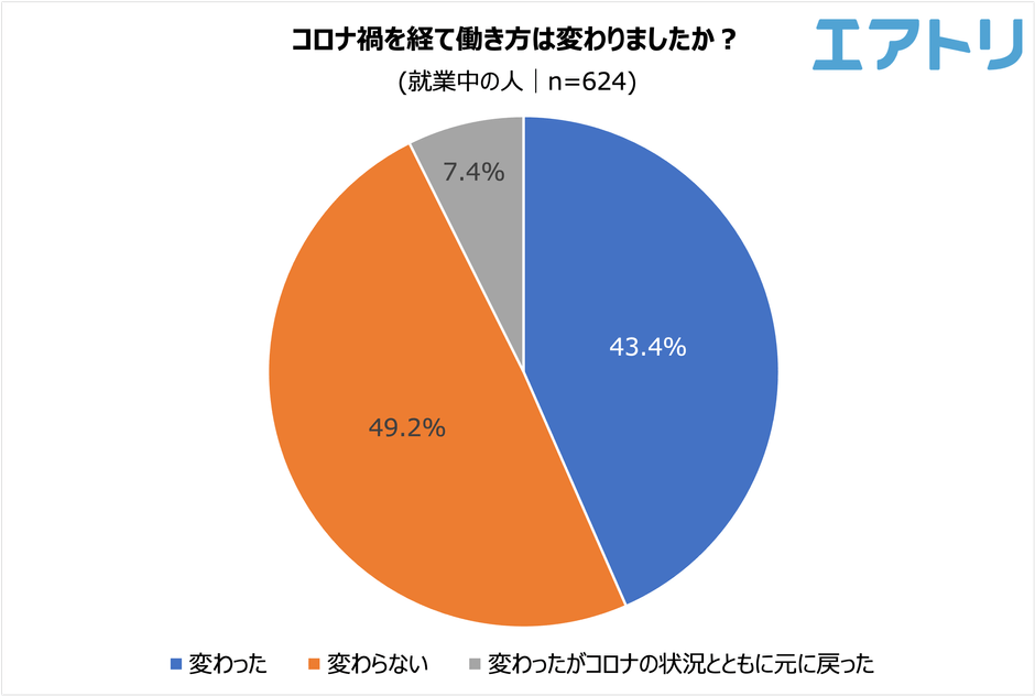 就業中の人で、コロナ禍を経て働き方が「変わらない」人が最も多く49.2%、「変わった」人は43.4%、「変わったがコロナの状況とともに元に戻った」人が7.4%でした。
