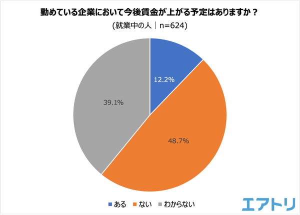 就業中の人で、勤めている企業で賃上げの予定は「ない」人が48.7%、「わからない」人が39.1%、「ある」人は12.2%でした。