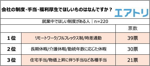 様々な独自制度が設けられている会社がある一方、どんな制度がほしいかを聞いたところ以下のランキングとなりました。
