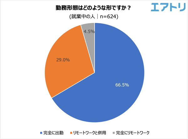 就業中の人の勤務形態は「完全に出勤」している人が66.5%と最も多く、ついで「リモートワークと併用」が29%、「完全にリモートワーク」という人は4.5%でした。