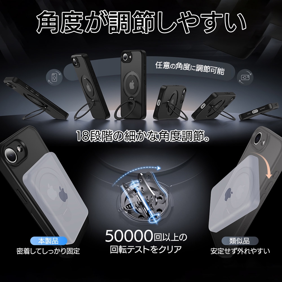 指が通せて操作安心、120度開閉&360度回転でお好みの角度に調整可能な、MagSafe対応リング付き。