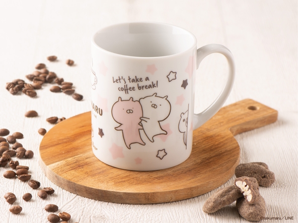 チェンジングマグは、カップや樽の中からうさまるがひょっこり顔を出したり、周囲に散りばめられた星がコーヒー豆に変化するデザイン。うさまる・うさことほっと一息コーヒーブレイク♪