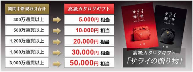 本キャンペーンは、キャンペーン期間中における外国為替保証金取引(FX)『選べる外貨』での新規取引数量に応じて、最大50,000円相当の『高級カタログギフト』をプレゼントします。プレゼントの内容は、ロングセラーや職人の手業が生きるモノ、歴史や伝統が息づく美味、さらに大人にふさわしい心地良いサービスなどを吟味・厳選したカタログギフト『サライの贈り物』です。