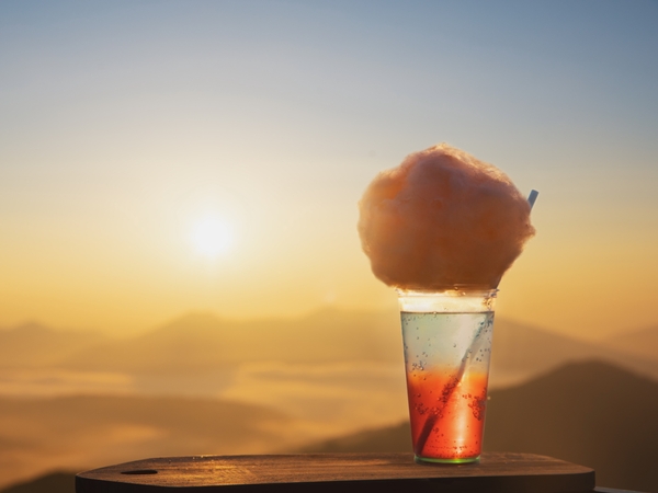 雲海テラスにある「てんぼうかふぇ」では、サンライズゴンドラの運行期間中、期間限定で新しいドリンク「秋色雲海ソーダ」を販売します。ドリンクの橙色と水色のグラデーションは、青空が徐々に朝日に照らされて赤く染まっていく様子を表現しています。柑橘の香りが感じられるフルーティーな味わいです。上には、ほんのり赤く色づいた雲海をイメージしたふわふわの綿あめが添えられています。