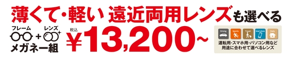 薄くて軽い遠近両用レンズが付いて、メガネ1組 税込¥13,200より、豊富にご用意しております。