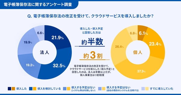 ・法人の半数以上が電子帳簿保存法に対応済みと回答。個人事業主は2割程度にとどまる。