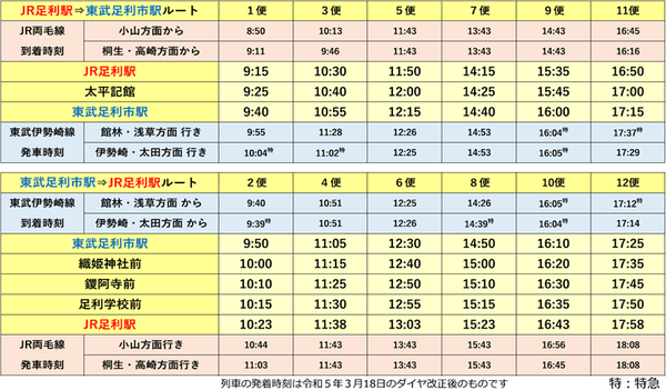 (JR足利駅→東武足利市駅 約1.8km/東武足利市駅→JR足利駅 約2.9km)