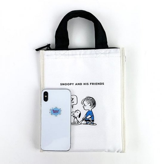 Lサイズをスマホと比較しています♪ベージュのカラーのバッグには、抱っこされるスヌーピーのほっこりデザインが描かれていますよ♡持ち手はブラックなので、バイカラーで楽しめます。