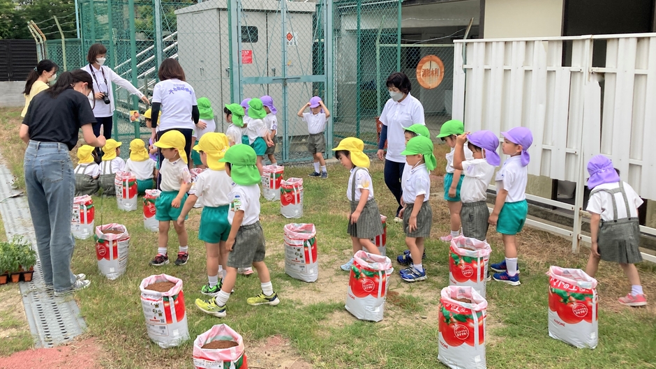 2022年度はプロジェクトテーマの一つでもある「ベジキャンパスの実現」に向けて、学生たちが大学内にミニトマトを栽培する企画を考え、2022年6月に併設園でもある大阪国際大和田幼稚園園児に参加していただき、「ミニトマト苗植え体験会」を実施いたしました。