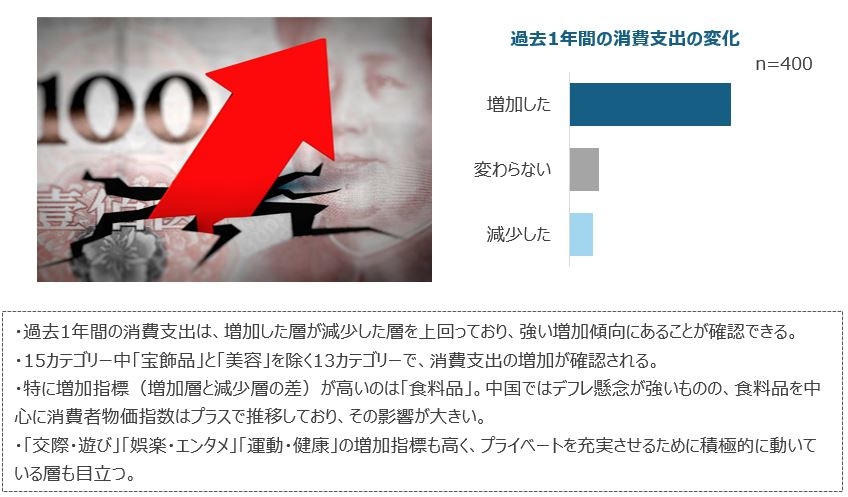 ■過去1年の消費支出は強い増加傾向に。食費のみならず、リア充にも積極的。