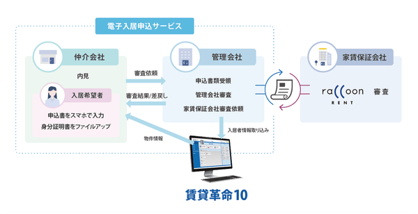 入居申込をオンラインで完結する日本情報クリエイトの「電子入居申込サービス」とラクーンレントが提携を行うことにより、家賃保証サービスをご利用いただく入居希望者様、仲介会社様、管理会社様はこれまでと比較して、手書きでの保証申込書作成の手間や記載漏れの確認などのストレスが少ない、スムーズな保証審査が可能となります。