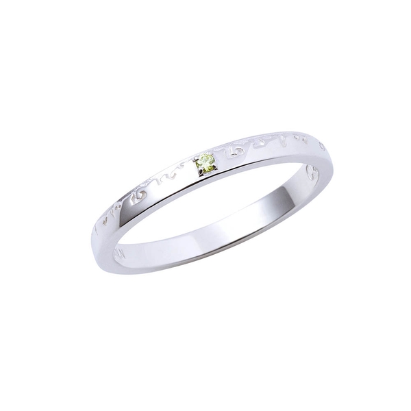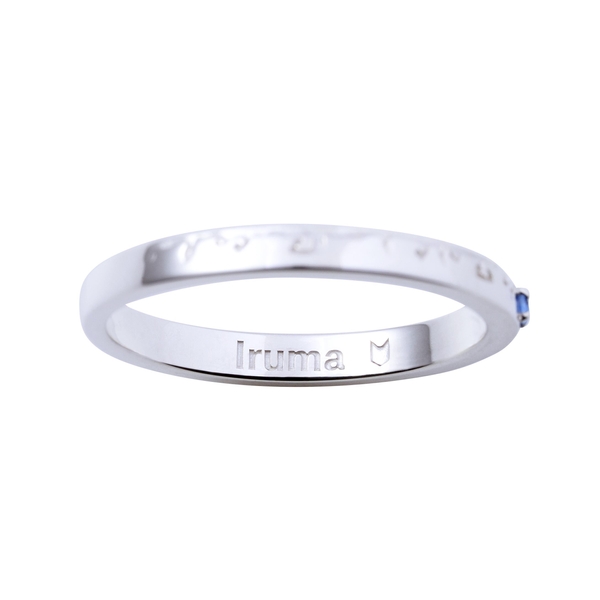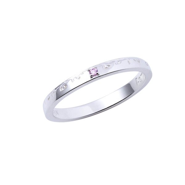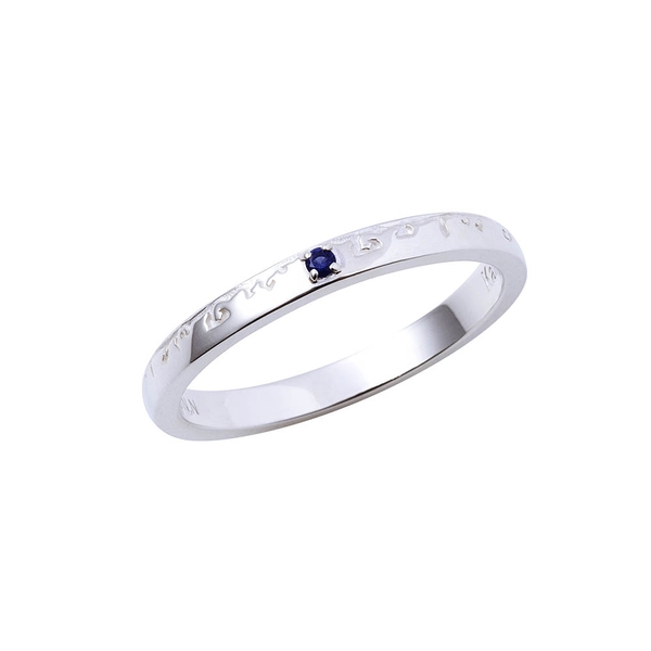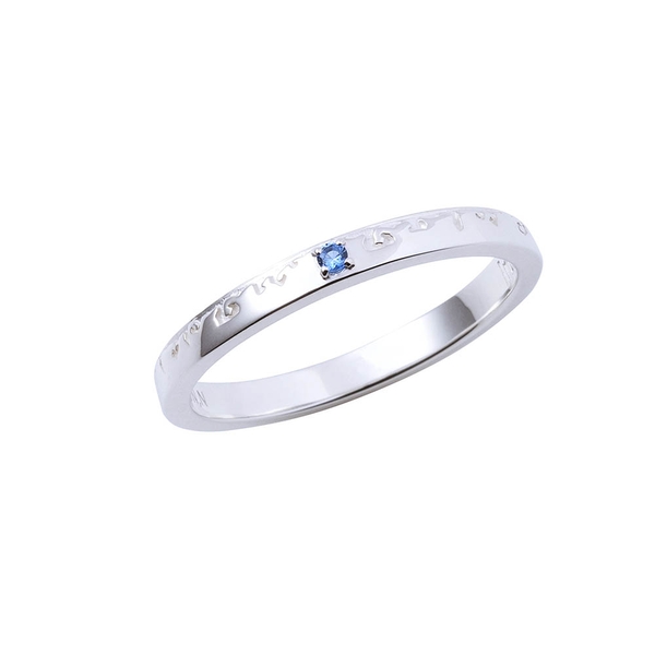 平打ちリングに魔界を連想するイバラのデザインを取り込み、イメージカラーストーンをセット。内側に名前と使い魔のアイコンを刻印しました。
