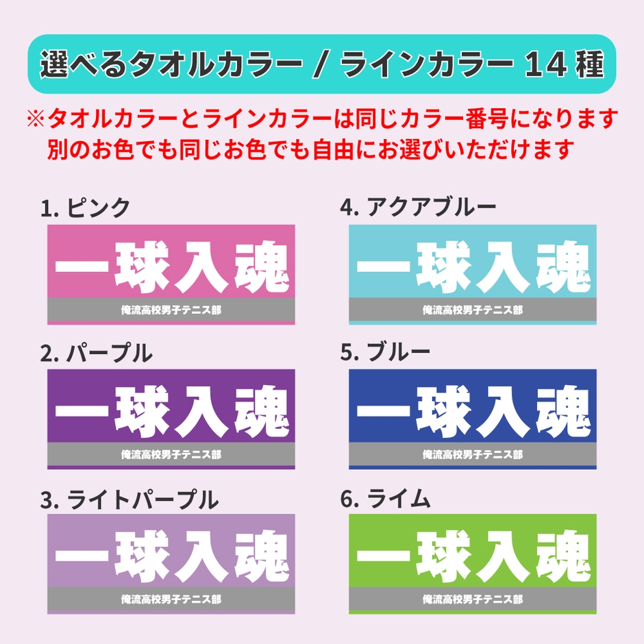 応援の気持ちを存分に表現できる「横断幕風フェイスタオル」は、カスタマイズ性に優れたアイテムです。フォント6種類、フォントカラー8種類、タオルカラー14種類、ラインカラー14種類からお好きな組み合わせを選ぶことができ、文字も自由に決められるため、完全オリジナルのデザインを楽しめます。